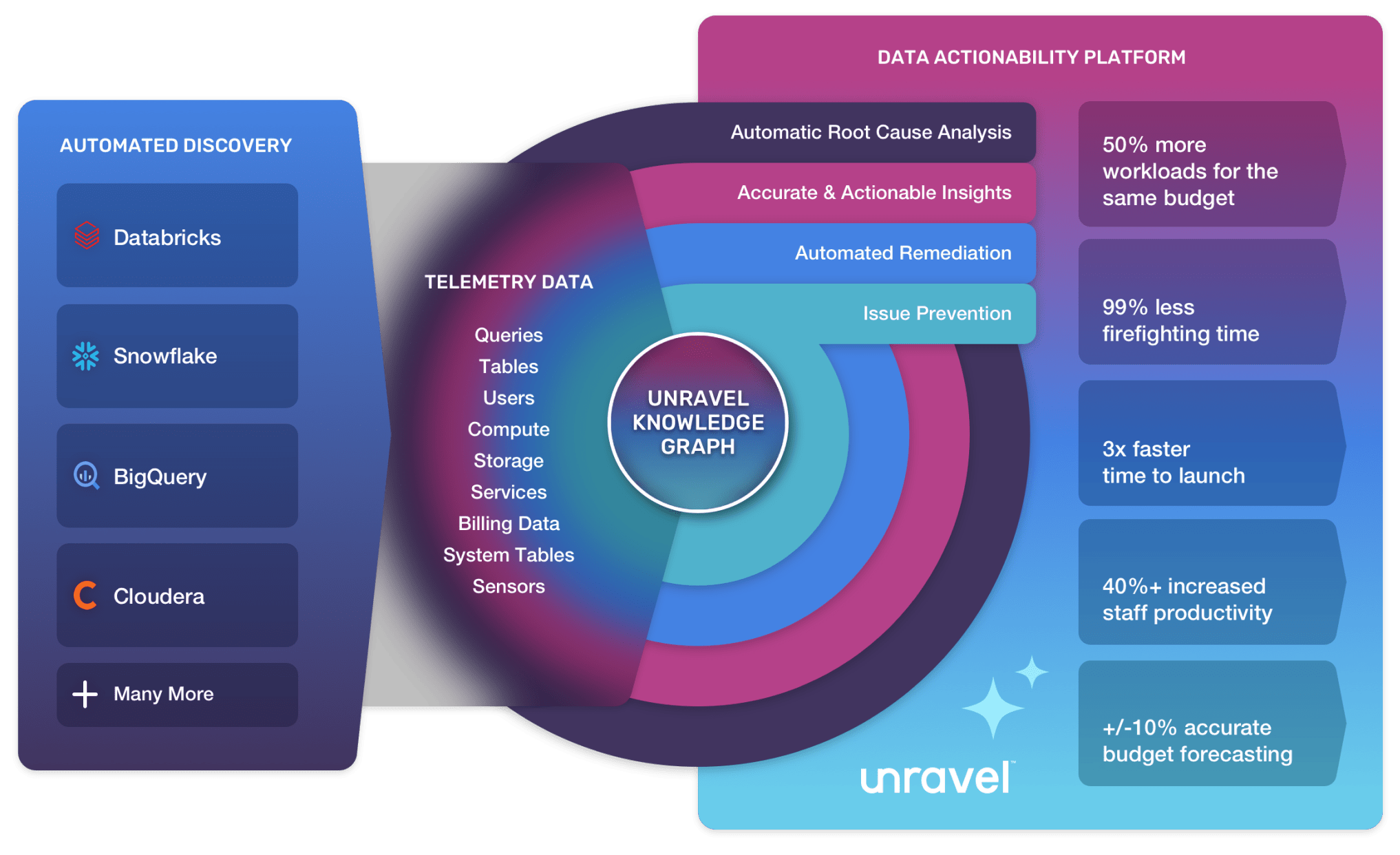 Unravel enables you to dramatically reduce cost, improve performance and ensure the reliability of your Databricks, Snowflake, Google Big Query and Cloudera data platforms. Unlike other Observability and FinOps tools, Unravel provides you with much more granular visibility, AI insights and automation driven by the industry’s most comprehensive and proven knowledge graph.