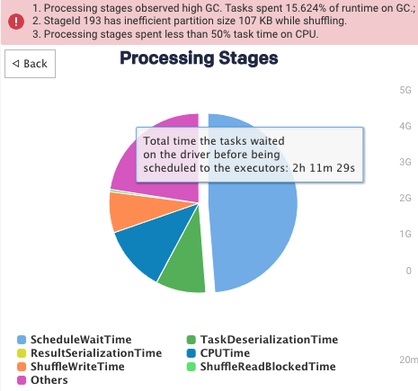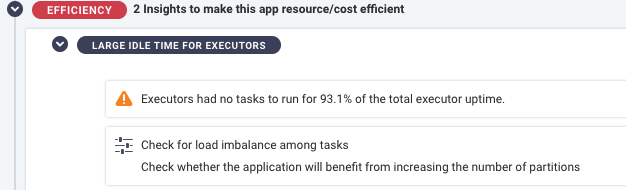 The above is a breakdown of what the job was doing for the whole time. Nearly 50% was spent on ScheduledWaitTime! This leads to the Executor idle time recommendation: