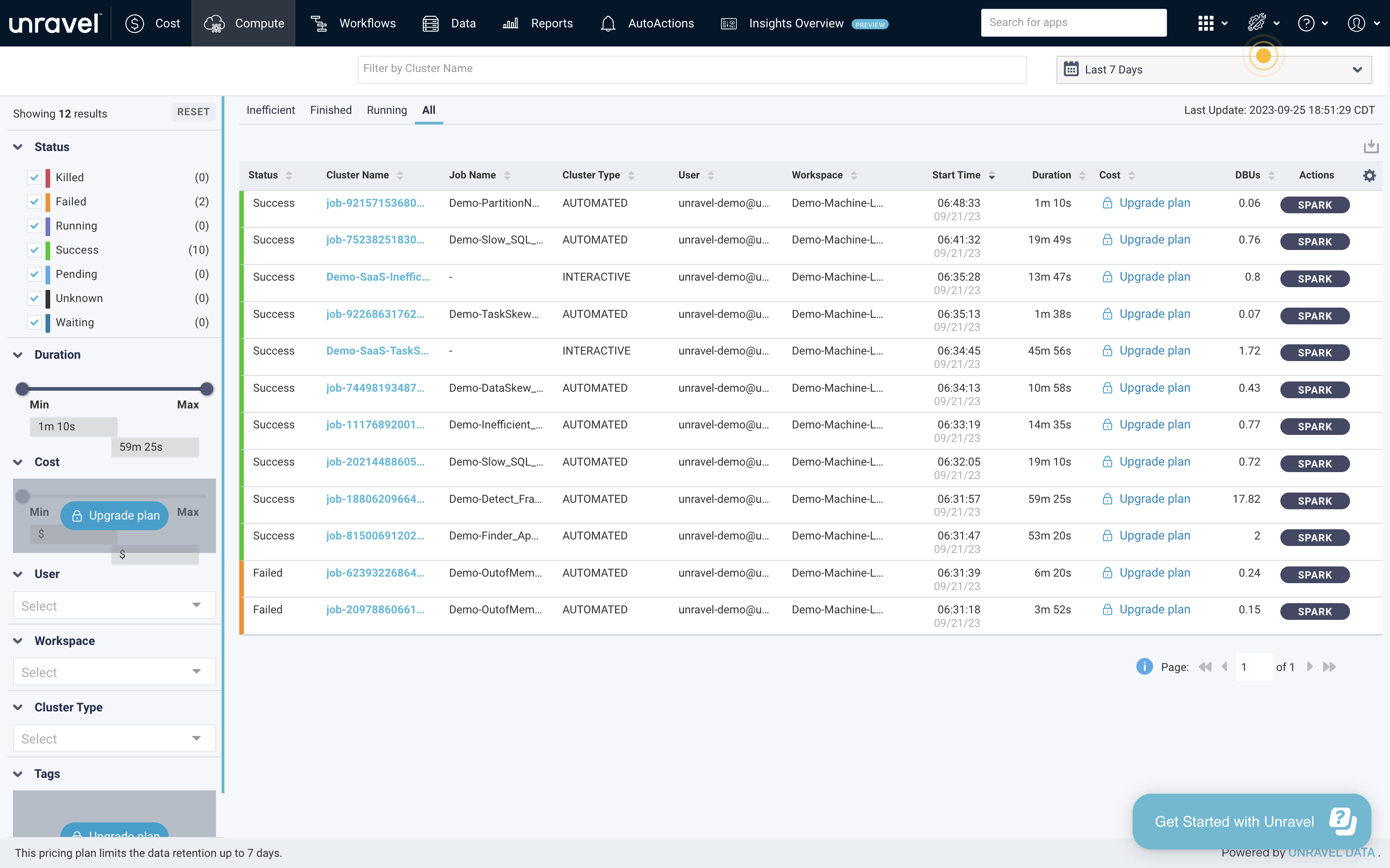 A single errant job or underutilized cluster can derail your efficiency goals and delay critical data pipelines. The ability to see job and cluster performance and efficiency in real time provides an early warning system.