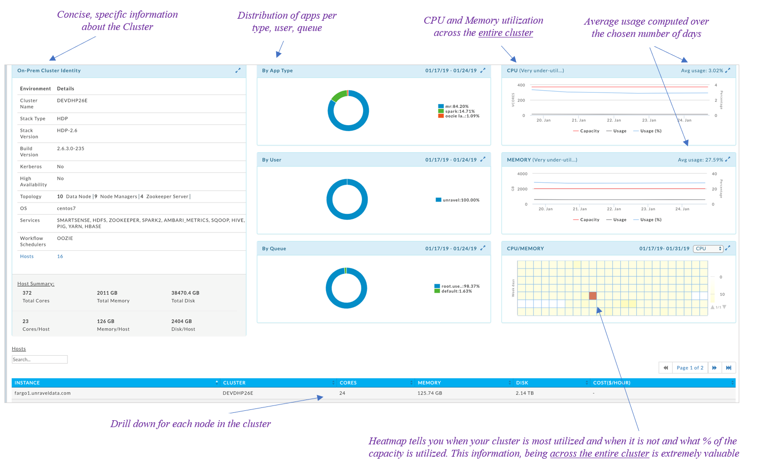 Unravel’s Cluster Discovery Report is purpose built for migrating data workloads to the cloud. All the relevant information is readily made available and all the number crunching is done to provide the most relevant details in a single pane of glass.