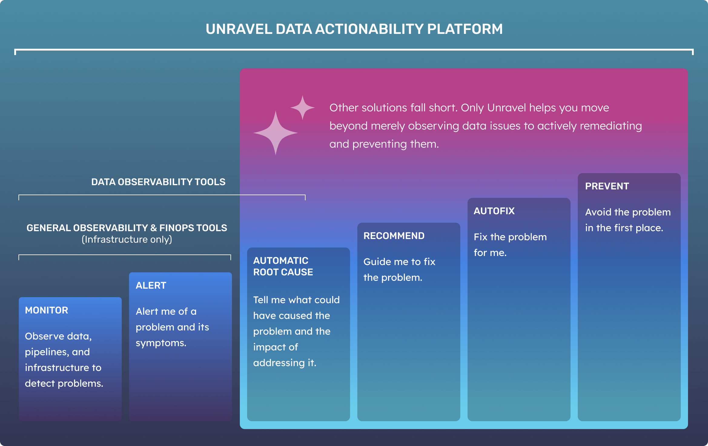 For optimization, Unravel’s AI pinpoints root causes across queries, compute, and storage, delivering specific recommendations for query rewrites and adjustments to warehouse, cluster, and table configurations, ensuring actionable and effective cost savings.